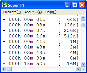 SuperPi is another entirely CPU-dependant program. Although it doesn't have any real-world use or meaning, it's interesting to see just how fast processors can get.