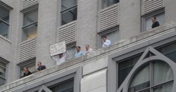 Perhaps 10 minutes before the opening, some office workers from the Bergdorf Goodman Building across the street came out on the balcony with a dry-erase board saying "We[heart] U2 + [apple]" to the crowd's cheers.