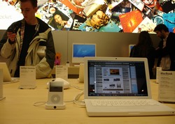 (view large image)White MacBooks, black MacBooks, everywhere MacBooks MacBooks. Only a few MacBook Pros on display since they are old news now.