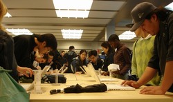 (view large image)This is the iPod Bar, the Genius Bar, and the Studio. The first two are staffed by The Geniuses, and the Studio is staffed by The Creatives. The Creatives are too original to wear black like the rest of the staff, so they wear grey. Apple calls the Genius Bar and its two spinoffs the "heart of every Apple store". This is the place to go for face-to-face advice with Mac products and for technical support and repairs. Many services performed at the bar are free.