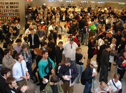 I arrived about 15 minutes before the store opening at 6 PM. Lines stretched around both corners of the GM Building behind The Cube. Most of the GM Plaza had been fenced off and the crowd spilled off the sidewalk into the street, a part of which was also fenced off by the police to protect the crowd from traffic. Police presense was unbelievably small for New York City, given the number of people.