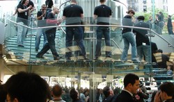 (view large image)So will the Apple Store Fifth Avenue become "a favorite destination for New Yorkers and people around the world" as Steve Jobs hopes? (http://www.apple.com/pr/library/2006/may/18retail.html) It's too soon to tell, but if this guy with two of his own Mac laptops and a folding chair is any indication, this is another crazy idea that just might work.