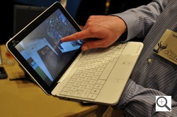 Not to be outdone, Lenovo also debuted the Lenovo IdeaPad U1 hybrid netbook and slate tablet/smartbook. Our entire staff was pretty impressed with this innovative concept ... and even more impressed that it's ready for sale. The IdeaPad U1 works just like a standard Intel Atom-based netbook with a full keyboard and touchpad running Windows 7, but with the flip of a switch you can unplug the touchscreen display and you've got an ARM-based tablet PC ready for travel with it's own operating system and flash storage. What makes the U1 even cooler is that you can connect the bottom half of system to an external monitor and use it as a Windows desktop PC while the top tablet portion of the laptop is being used by someone else. When you reconnect the tablet to the bottom half of the laptop then the data will automatically synchronize so that you don't lose your work. Time will tell whether consumers want smartbooks with thin standard screens or if they're willing to buy a slightly thicker smartbook with a touchscreen interface.