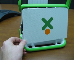 The design of the OLPC is very simple, yet incredibly well thought out. The notebook is shaped like a thin lunchbox, with a carrying handle on top. All edges are rounded off, and the flat surfaces of the notebook are textured for easy gripping. Screen latches are nothing like what you would find on a standard notebook, with the WiFi antennas themselves acting as the latch mechanisms.