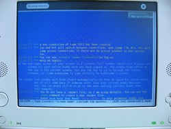 "Naim" chat application (view large image)Advanced users who have access to the internet can pull in updates and additional software through the console, making the notebook somewhat easy to maintain. One of the first programs I installed was Naim, which gave me very basic AIM instant messaging capabilities. While it doesn't look or feel anything like what people are used to, at least it worked.