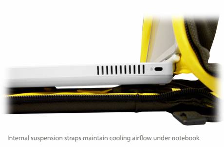 Thetekmod is simple to setup, if you just follow the instructions you will have your laptop situated inside in no time. The snaps on the bottom side of the bag are what provide the room for airflow under the laptop. Then the sides are completely open as can be seen in the picture, allowing air and ports to be free. The back opens up partially to provide airflow for the rear vents, and access to the ports. So keeping your laptop cool in this case should not be a problem.
