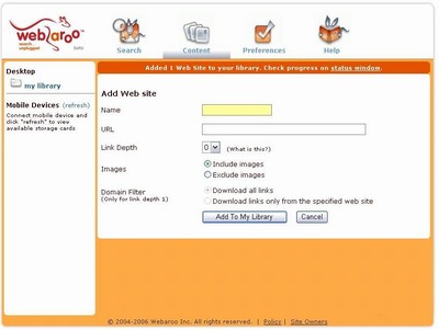 Form for adding a new website (view large image)When adding a new site, Webaroo offers several options regarding what to crawl and cache. Link depth, which only goes one deep, allows the user to cache just the linked page or pages that are one link deep as well. I'd like to see this option allow more depth, especially for links internal to the site being added. There is an option to include site links only or all links, which would include internal and external links, but again, only 1 level deep. If you select the images option, images on the host site will be displayed.