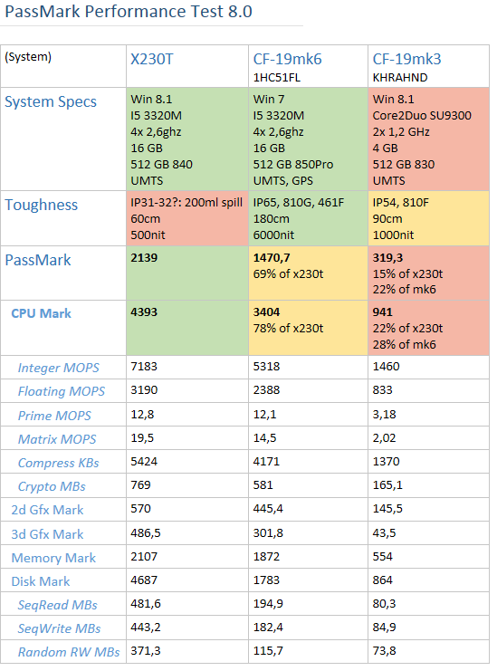 passmark comparison for i5-3320m/16ram/500ssd of thinkpad x230t and toughbook cf19mk6 http://toughbooktalk.com/download/file.php?id=1902Last edited: Jan 24, 2017Shawn likes this. -