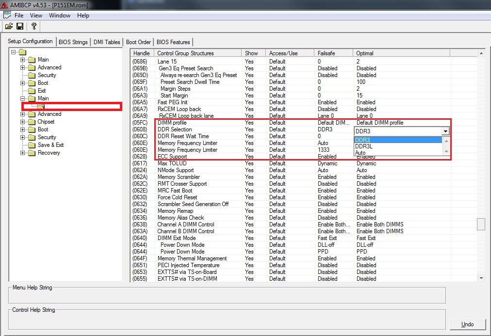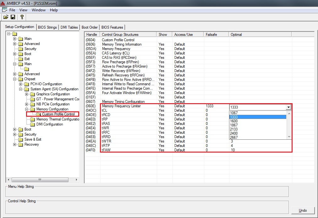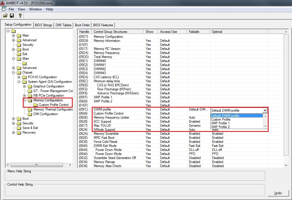 2. There seem to be multiple places within the P151EM1 BIOS and AMIBCP where memory values are stored. Of the attached images, which values should I change (‘Main.jpg’, ‘Memory Configuration.jpg’, ‘Custom Profile.jpg’