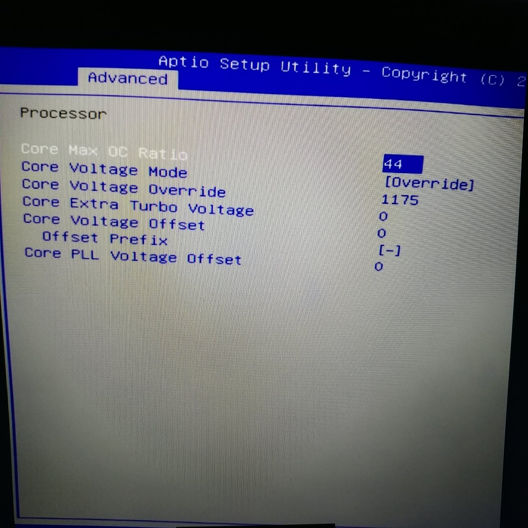 Yes, that is normal. Idle voltage is always higher. Test under load and you should see voltage drop down closer to that amount. It will always be a little bit higher than what you have it set to for Override. Also, if you have separate voltage for cache in your BIOS it needs to be set the same or it will override the core voltage. So, on the P870DM-G I had separate BIOS settings for cache voltage and core voltage. If your BIOS does, go in and set it override/static and matching core voltage. If you change it with XTU they will automatically be set exactly the same.