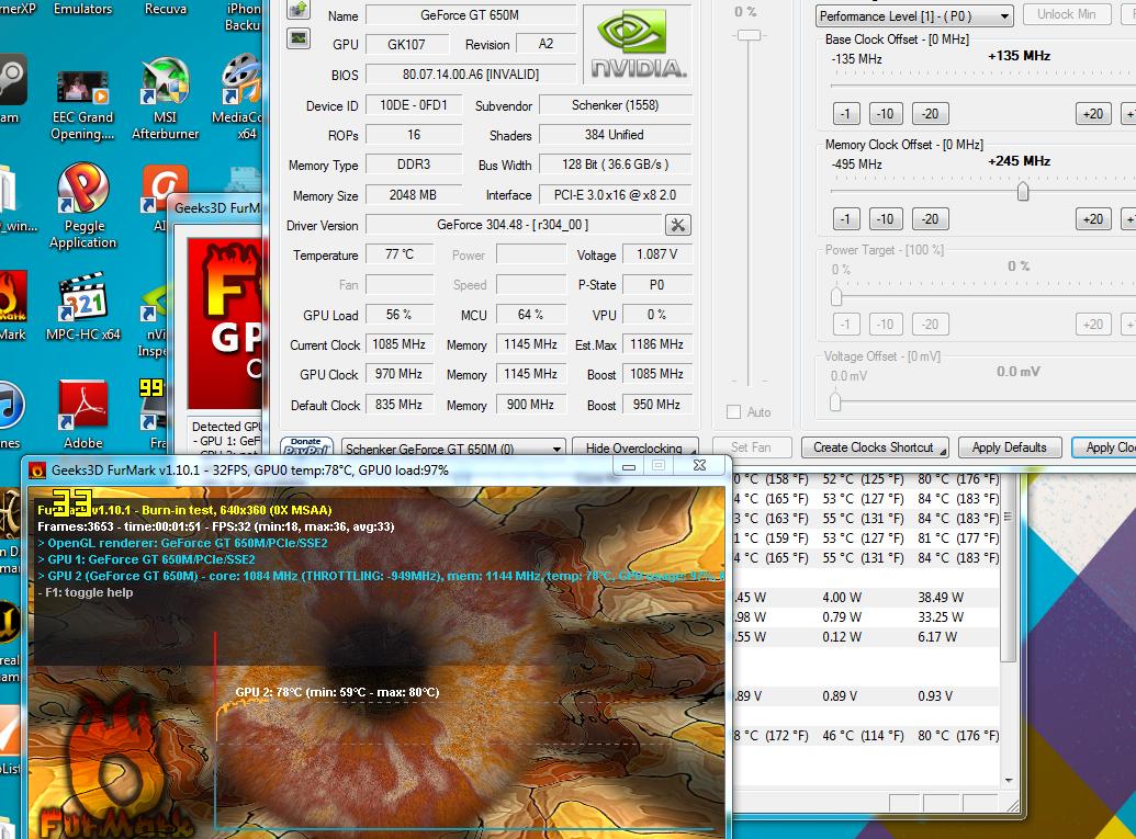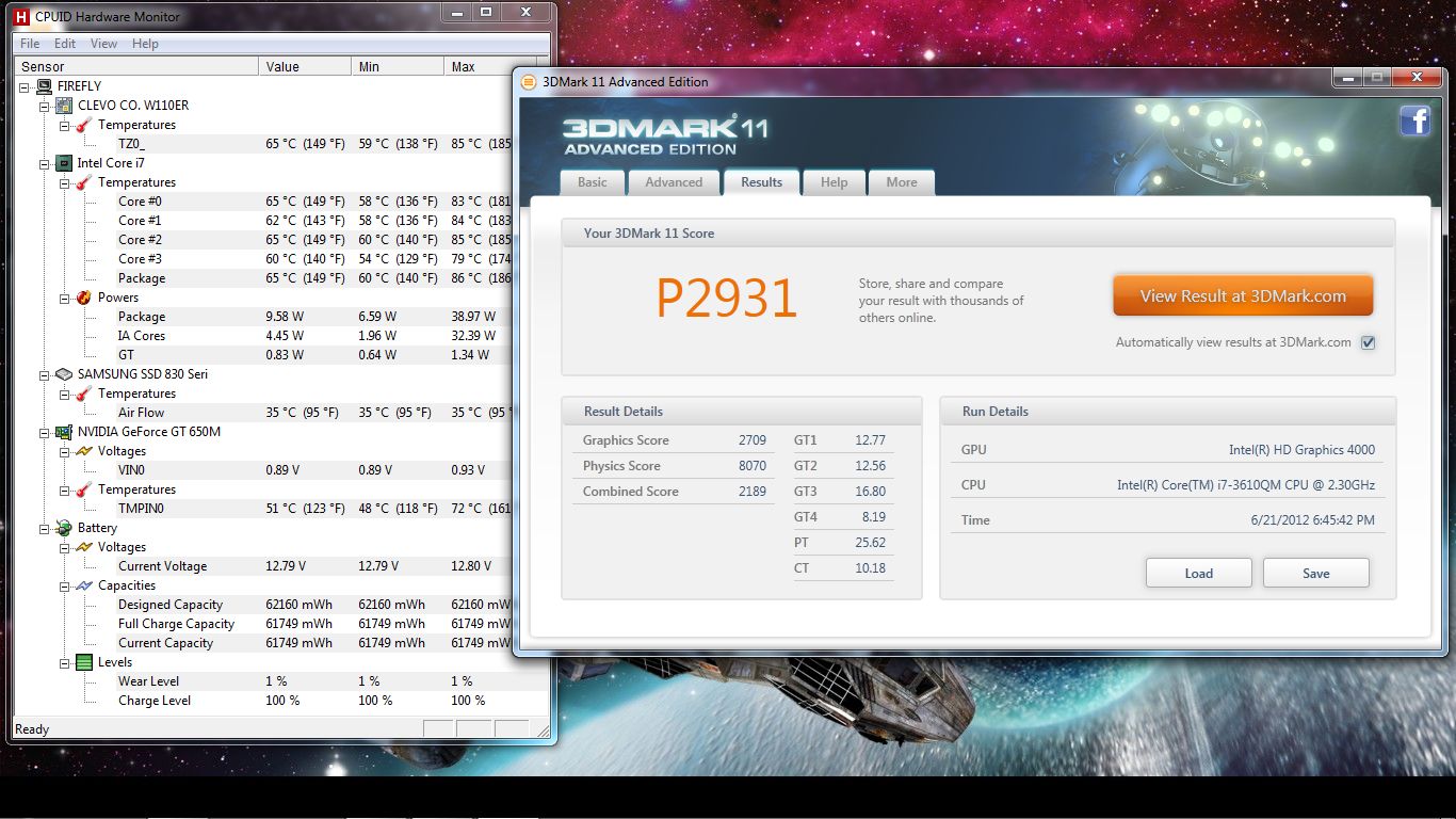 Have you found a way to get GPU faster than 900MHz? My vRAM will run at 1150MHz but beyond that I start to get artifacting. Plus your machine has the i7-3720QM and that extra CPU speed can boost the score a bit. -