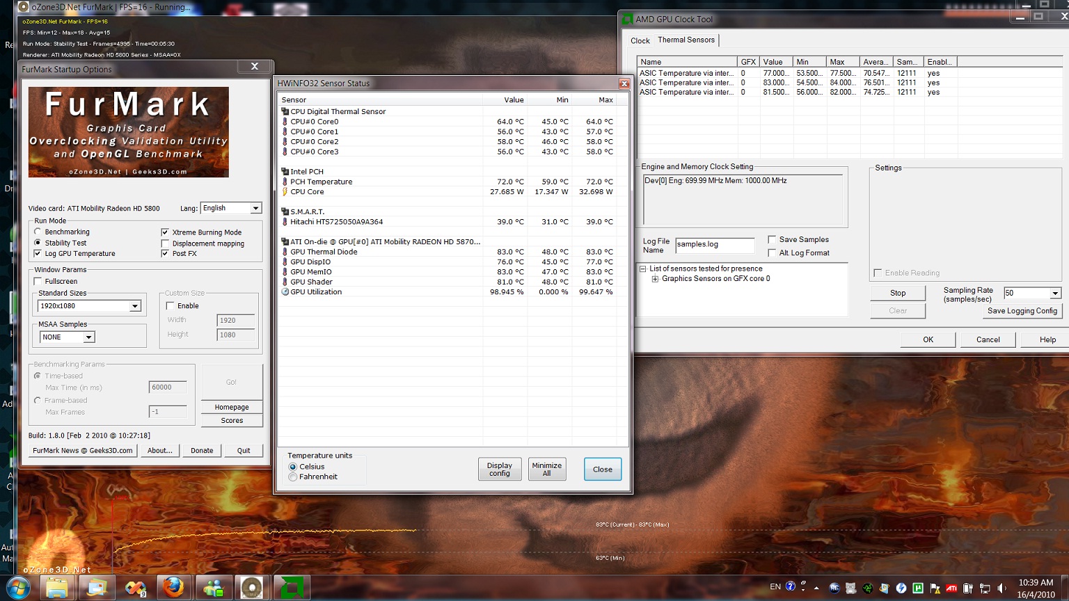My furmark temp while OC 800/1100, and stock 700/1000 respectively, current ambient temp here is 36C.
