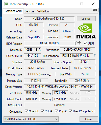 Edit: corrected valuesClick to expand...The screen going black at stock or with a minor overclock is a classic symptom of defective GTX 980M. It should take an extreme overclock/overvolt before the screen goes black, and a really good GPU will typically crash the driver and reset (TDR) without the screen going black. Your GPU is in the process of failing. I had one in my Panther and one in the Sky X9 that had the same issue and this problem will only get worse over time. No point in doing more testing. You're just prolonging the inevitable. Quality control on NVIDIA GPUs, especially the GTX 980M has gotten to the point of being pretty horrible. This is happening frequently enough that it makes good sense to put SLI benchmark scores on the back burner for now and go with the 200W GTX 980.GTVEVO said: ↑I know we have discussed this and you know I feel since you have a 980m in the primary slot that those temps are above average. The black screen leads me to an issue with the card but I would want to test both the card and heatsink exchange.