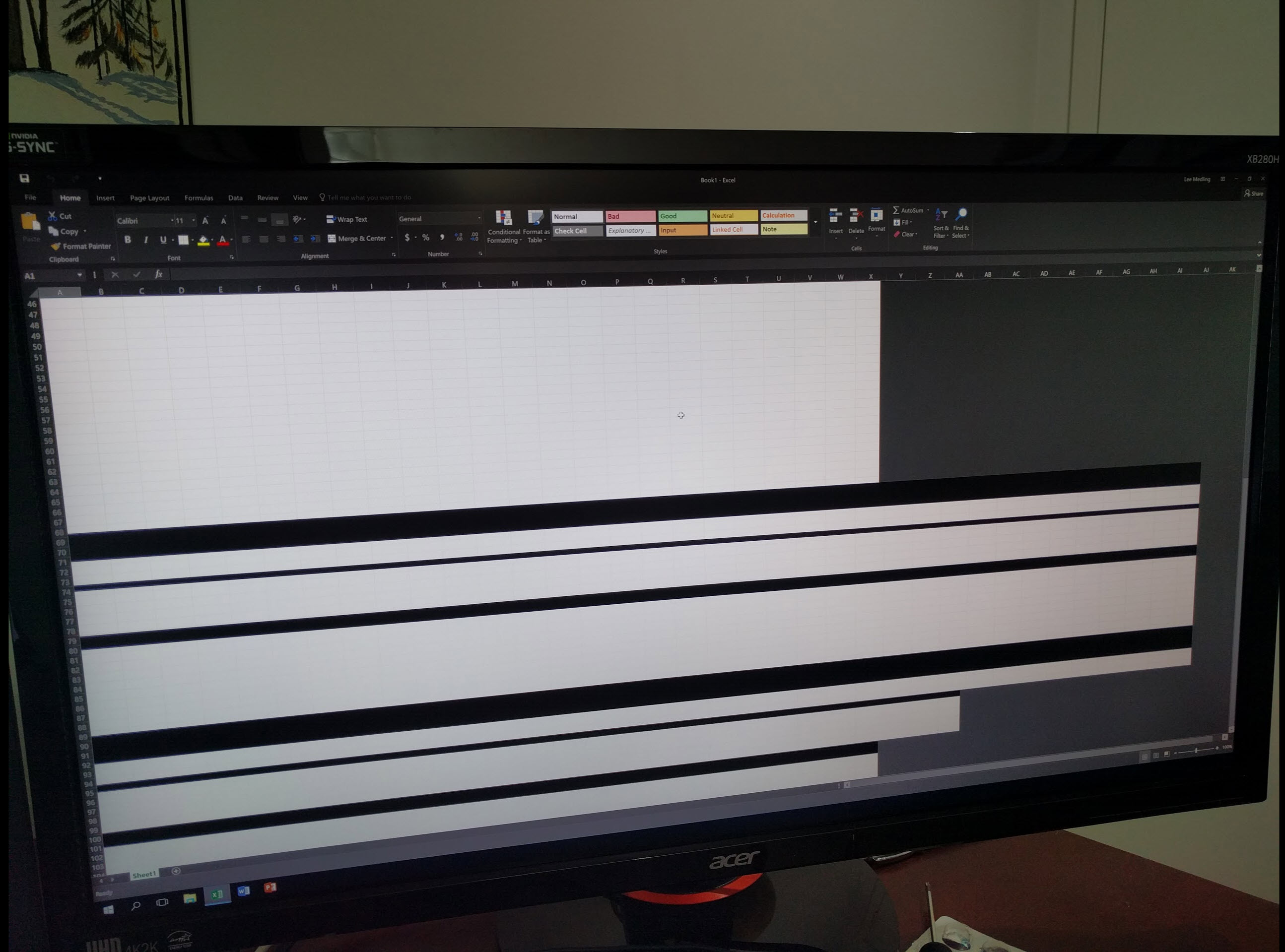 G'day all, having a big drama trying to use Microsoft Excel and Word on my machine. Basically, running it on either my internal or external 4K screens at anything below 200% scaling causes massive display glitches in Excel, and display crashes when switching to a chart-type sheet. Word just blanks out sections of the page. I've attached a picture of how the screen looks on an Excel spreadsheet, scrolling down quickly or slowly just produces more of the glitches which remain on the screen, they don't get cleared or refreshed.