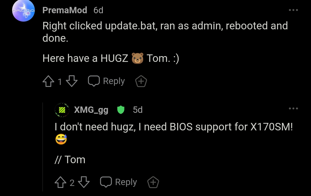 Couldn't agree more! This sense of "entitlement" is basically false. It is someone's personal work. They are buying the machine because they want to, not because he has forced them to do so. Now if you buy from his partners, you have the edge. If you are like me and don't have access to Prema partners anywhere in your local geographical buy zone then you just have to ask the man to do you the favor. If he does, all thanks to him. If he doesn't, I DO NOT have the right to sound all fired up and talk about "trust". There is nothing "wrong" with this machine in the first place. Even before Prema Mod, my machine was beating many desktops in terms of raw performance and thermals by doing some nifty tweaks and adjustments. Prema Mod is just the cherry on top for me. In order to put it into perspective for any newcomers, Prema is NOT owned by Clevo. This is his "personal" venture. If you want to get his firmware, either buy this machine from his partner or try to get it directly from him. Don't raise any "trust" concerns because they are utterly unfounded and borderline ridiculous.Last edited: Feb 23, 2021raz8020, electrosoft, jclausius and 1 other person like this.