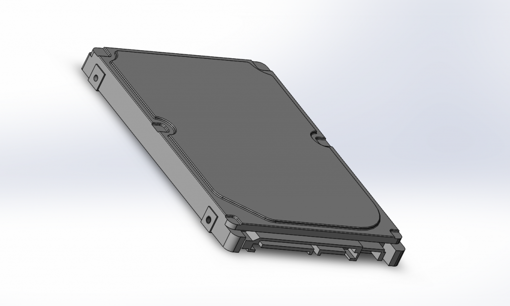 So, today I started by ripping open the laptop to get the drive out and see exactly what I'll have to work with. I easily got the drive out and decided that I would just use the screw on mounting brackets that are currently used to screw it down. Also, I modeled a 2.5" hdd so that I'd be able to create and assebly in Solidworks. I plan on modeling the ODD and then cutting it away and creating an assembly with the modeled hdd as a reference. I fonud I'll need a mini-sata male to sata female adapter and figured that, based on location, that a cabled version will be a better choice that a solid one. Here's a snapshot of the modeled hdd.