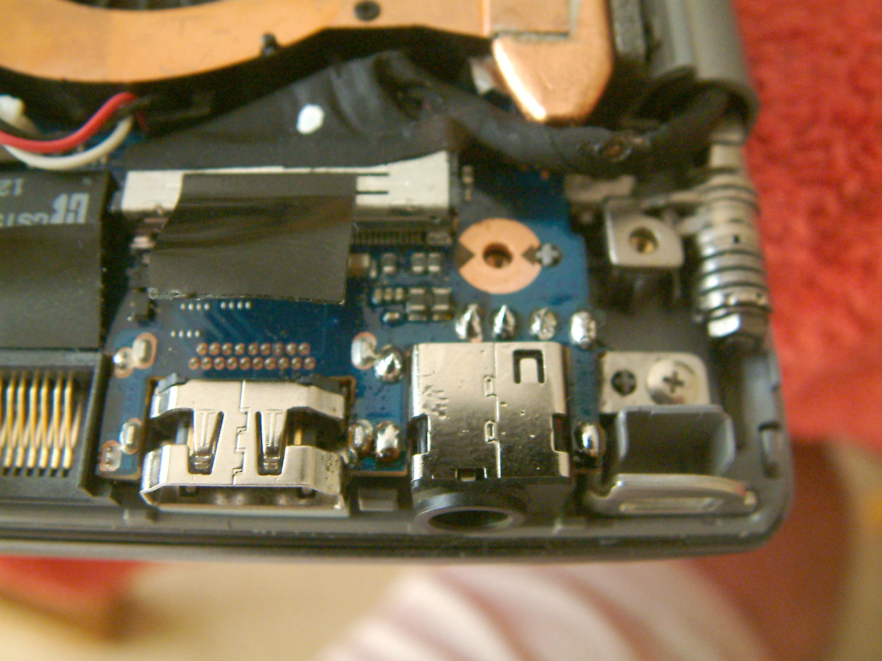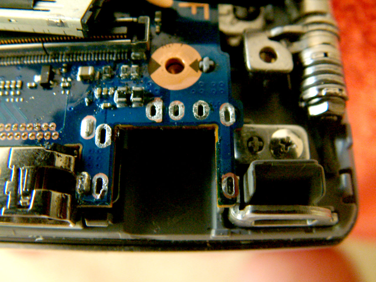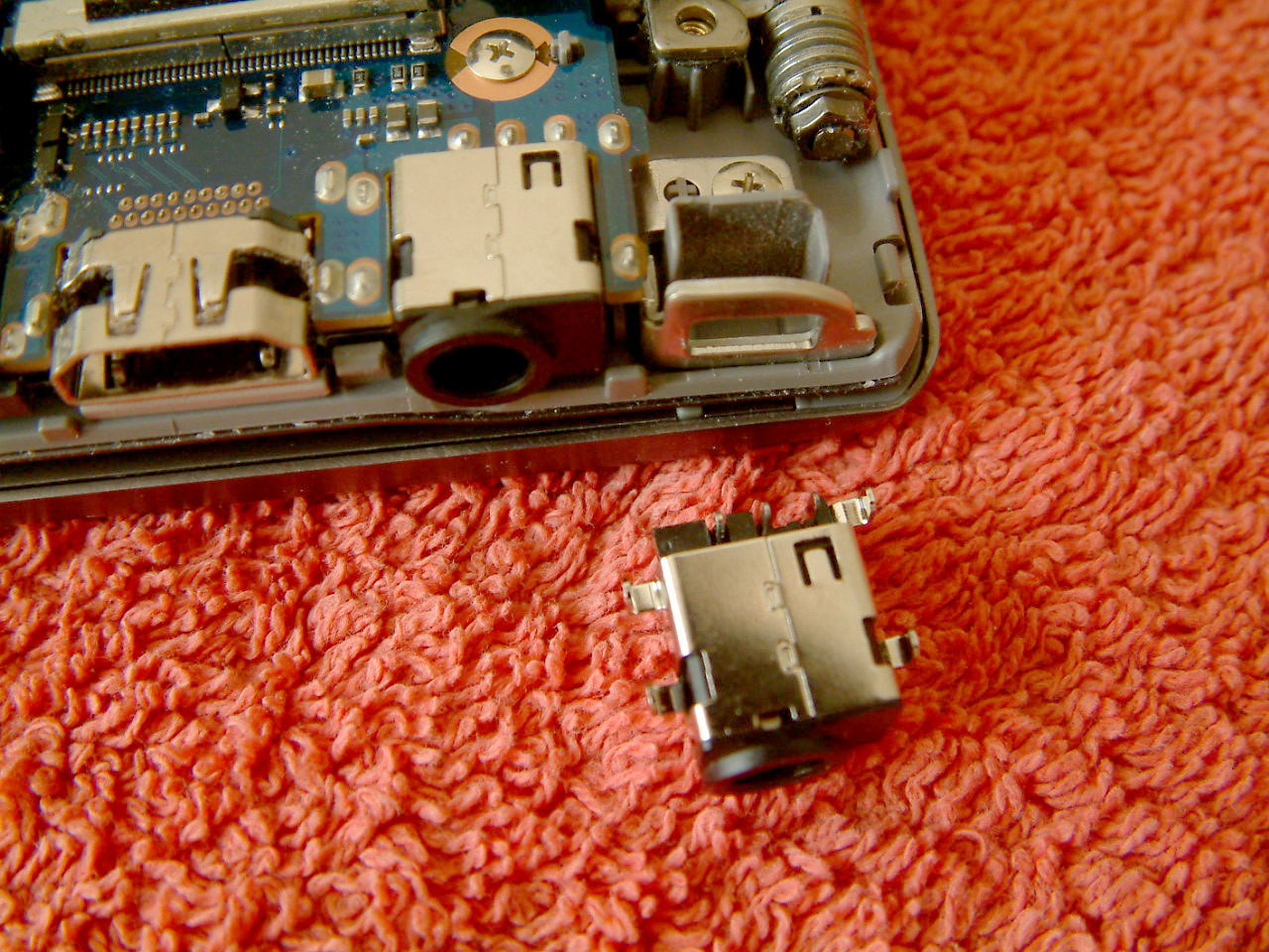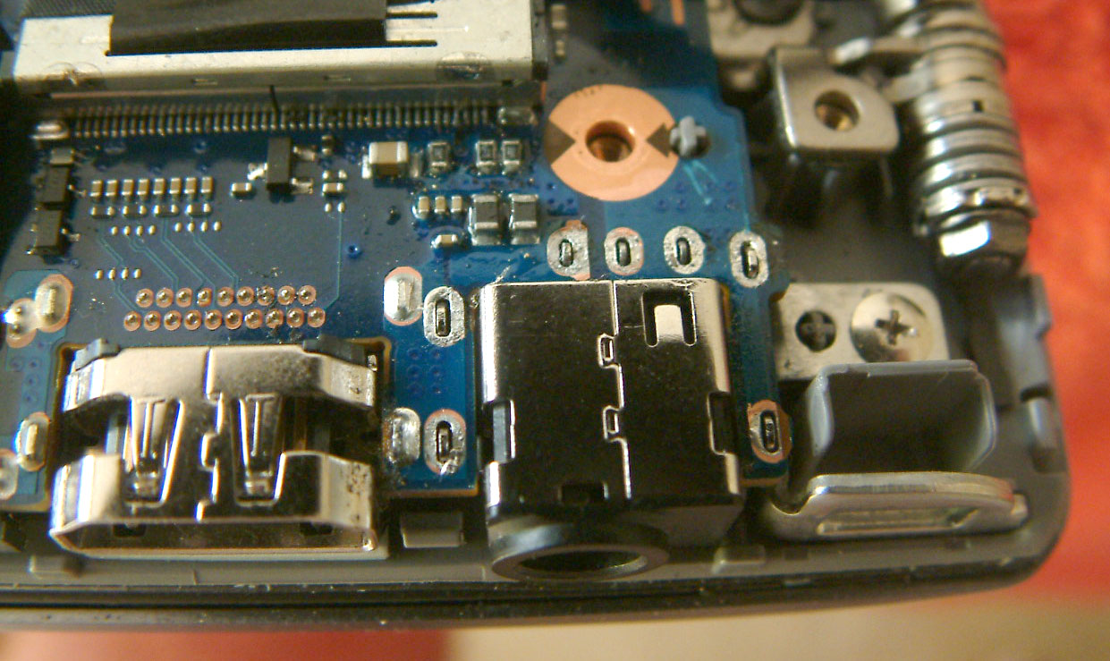 There is a guide already on how to remove the bottom cover, so once that was off I desoldered the contacts on the socket. I removed the motherboard securing screws which just gave me enough space to lift it a little and get the old socket out. Once the pads were cleaned up the new one went in, and soldered in place.
