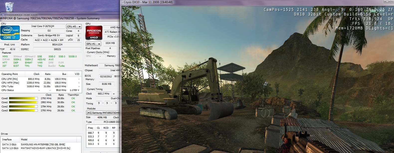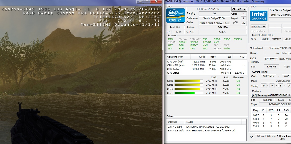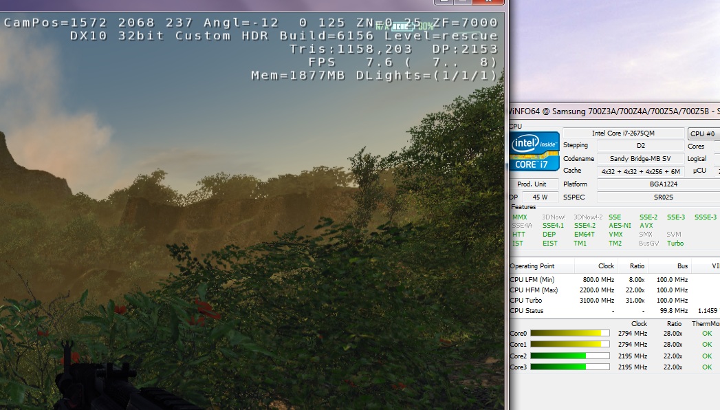 Tweaked it to run at 64bit and got no improvement. Here is another screen showing HWiNFO, with Crysis running at 720p with high settings (about 7 FPS), and one last one on very high (about 5FPS).