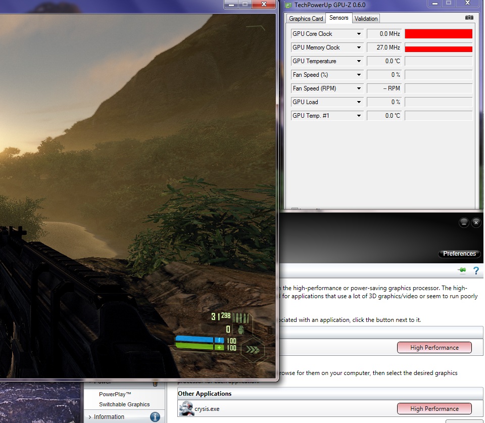 Well, GPU-Z has revealed the truth. Crysis refuses to recognize the AMD card. Even with High Performance selected, it only runs on the integrated Intel chip. No wonder I'm getting such crappy performance.
