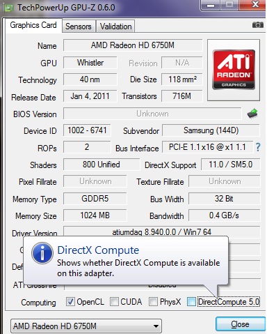 I believe the DirectXCompute is in this model. However, because of the driver, GPU-Z cannot show everything correctly. I'll check this week to see if mine driver is running fine some game. Post result later.