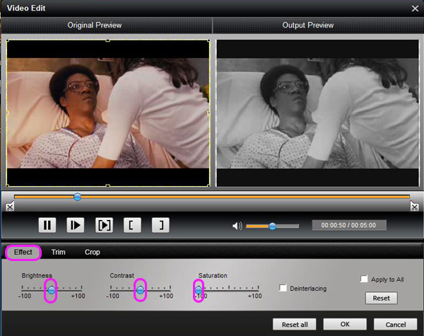 Click Effect button you can do these actions: adjusting brightness, contrast and saturation of the video. You can easily adjust the video through two windows in the same interface.