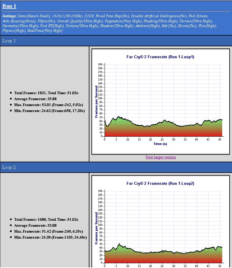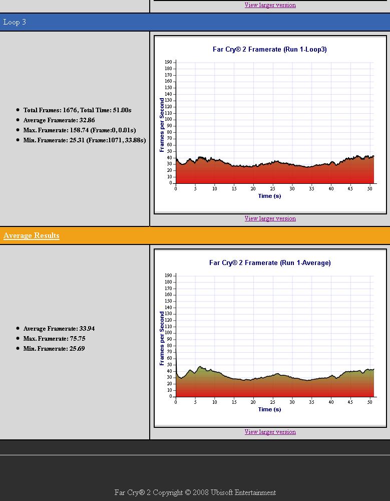 Far Cry 2 benchmark, no overclock and stock video drivers--176.49. The game tells me, "your video drivers are old please update them" at every start.