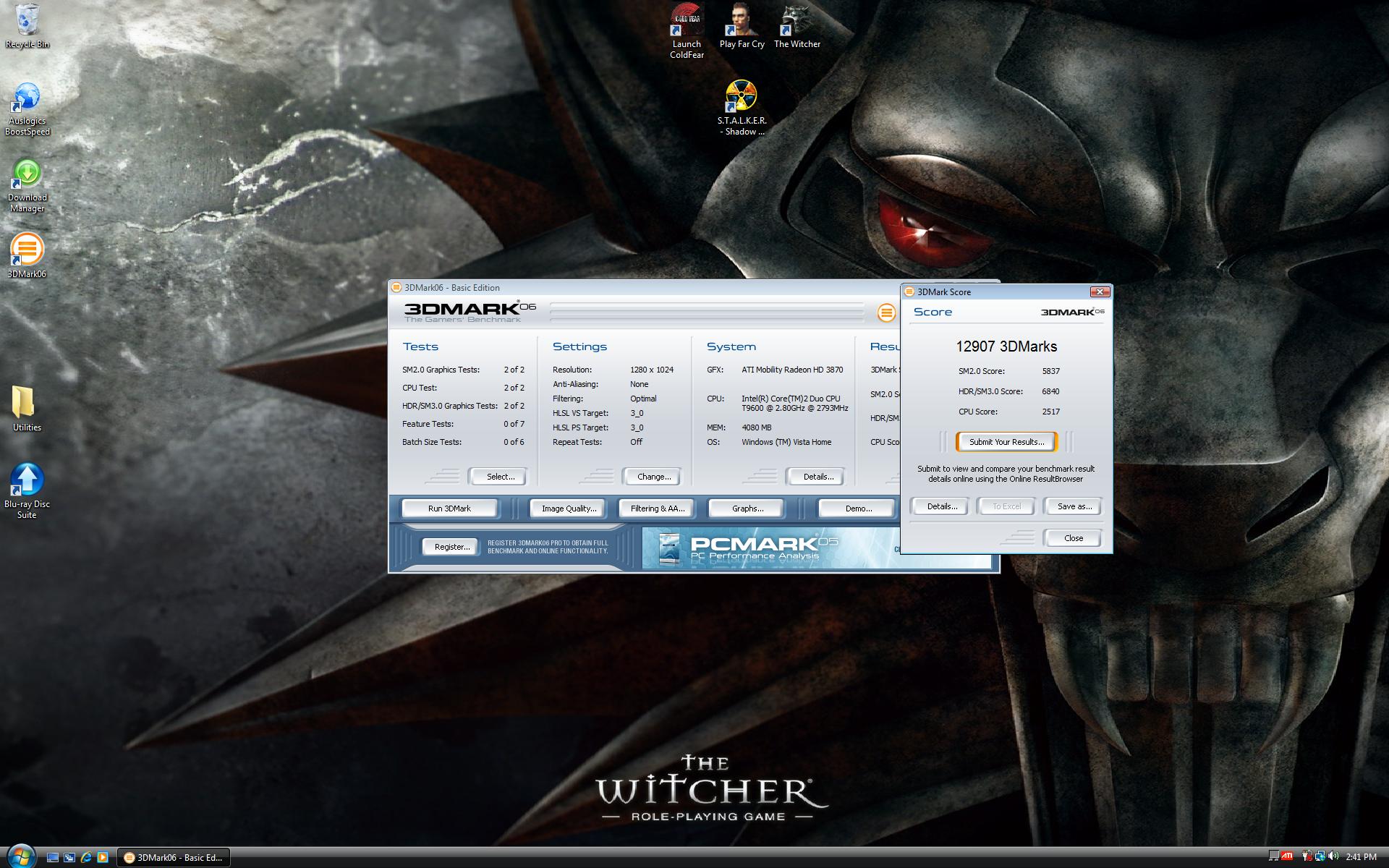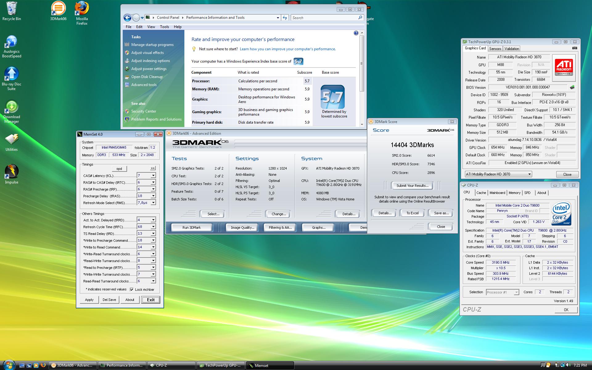 I know this is off-topic, but here are my new specs. As a Qosmio owner, I am now trying to sell a wonderful X305-Q701. I will post a thread in the NBR Marketplace soon. Until then, here are the specs for my new OCZ Extreme W840DI Whitebook. I used stock GPU settings for both tests, as you cant overclock them right now, but I did OC the Intel Core 2 Duo T9600 to 3.19 ghz, using SetFSB.