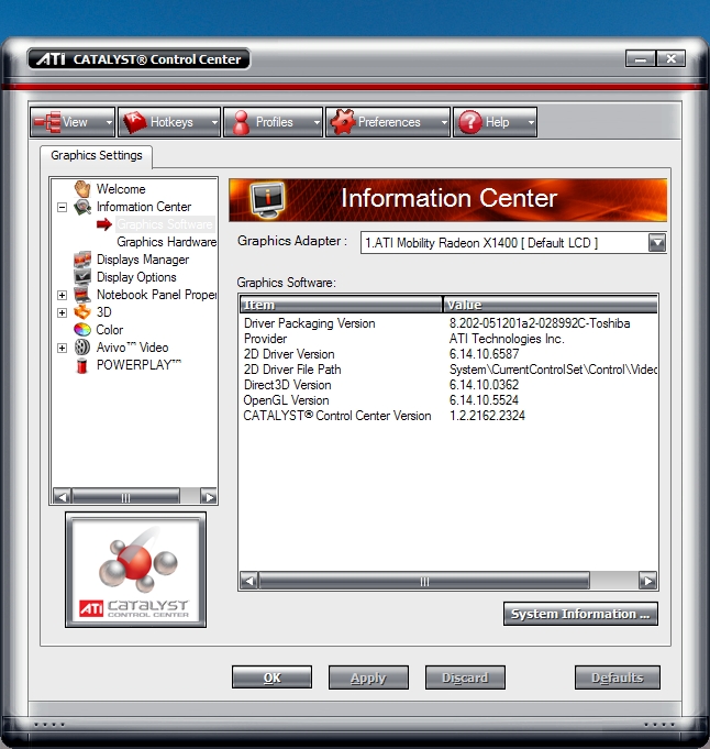I though hopefully a driver upgrade would do the trick. But following the ATI Cataylst Control Center homepage link I found that the Catalyst® Mobility 7.1 Display Driver for Windows XP Professional ( http://ati.amd.com/support/drivers/xp/mobility-xp.html) doesn't support Toshiba laptop's and it recommended my manufacturer's website for downloads. But the Australian Tecra A6 driver page has no drivers for x1400 either?