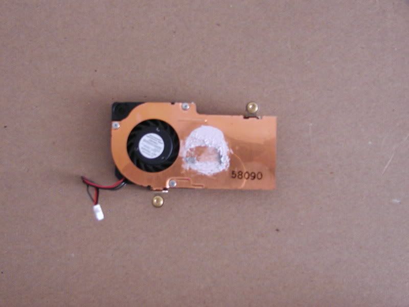 I figured since I was already in, I would go ahead and remove the heatsink and fan and see what the thermal situation looked like. As you can see from the picture above and the picture of the heatsink below, there was a gob o' thermal paste.
