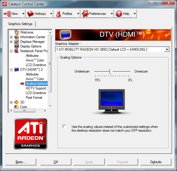 EDIT: I enabled GPU scaling under the DTV (HDMI) Attributes and now I go the option to overscan and it works! I can make the picture take up the whole screen of the TV!