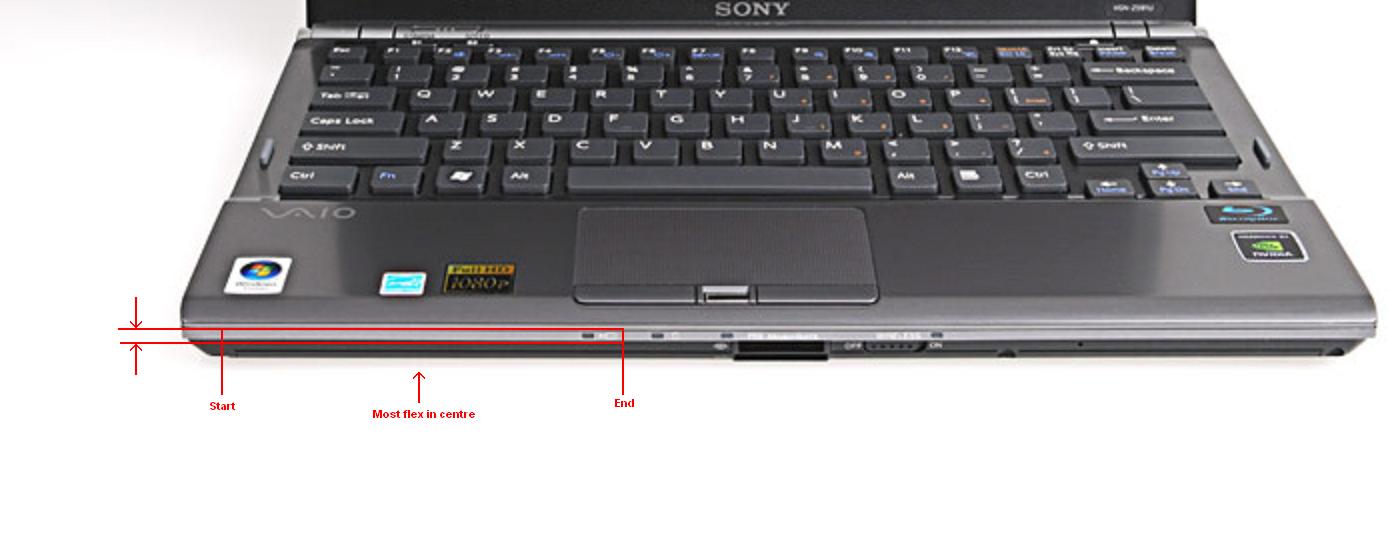 1. There is a fair degree of flex on the front left handside of the notebook. It is the plastic strip that contains the status LEDs. There's no flex on the right hand side at all which makes me think it could be a defect. Could someone check theirs and see if it flexes in the same location? (jpeg attached)