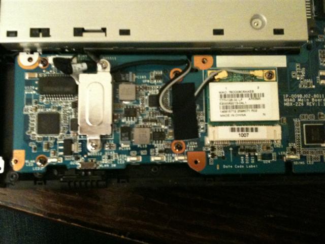 Next is a close-up of the wifi card (this is the original Atheros) there are 2 more screws to remove here and the 2 antennas which can be detached by gently prying them off with your hands. This is a half-height card and easily pops out once the screws are detached. The N-6300 fits in easily and I reattached the two antennas, I did not have a third available at the time, and currently have no need for one.