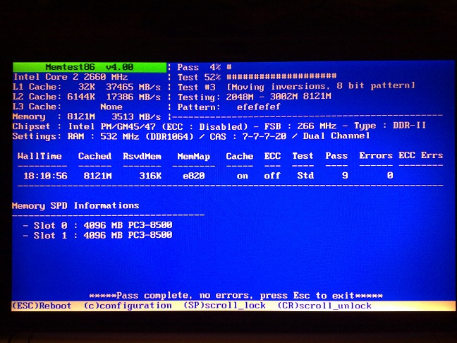 It's the first time that I've realized 1066MHz is way too slow for 8GB capacity. It takes about 2 hours to finish a pass. On previous setups (e.g. 2GB 533MHz, or 1GB 333MHz) it takes only about 1 hour to finish a pass.