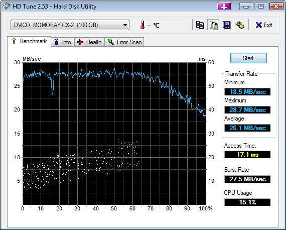 I then un-docked from the docking station and connected the USB harddisk directly to my notebook. Suddenly it was showing results between 26.4 MB/s minimum and 26.8 MB/s maximum. -