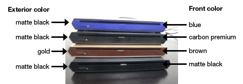 That review mentions it quite specifically: The PMDs for the black, blue, and carbon premium options will all have a standard matte black exterior. The narrow front face-plate (with the slot for the optical drive) will match your color option -- black, blue, or carbon premium. Only the PMD for the gold option will have a different exterior color -- gold -- and the face-place will be brown.