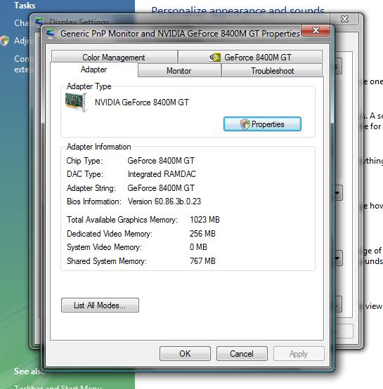 and performance in 3d is average, good for what I need. 64 MB dedicated memory on my nvidia 7400 GO and 256 MB shared memoy for a total of 320 MB.