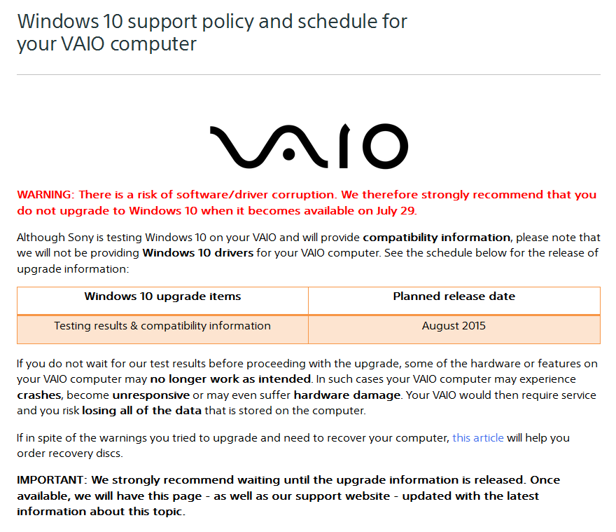 Don't upgrade to Windows 10 if you are using ANY Sony VAIO computer - at least not until the autumn / fall season of 2015.