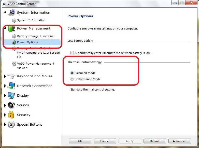EDIT: Alternatively, look at the photo below. That is a screenshot from the Vaio Control Center. Balanced mode will bring your fan speeds down, but make your notebook run a little warmer, but not much hotter than it currently is. Performance ramps fan speeds up to dissapate more heat. Performance mode is for when you know you'll be pegging out the processor usage, or playing video games, or generally anything that will intensely stress your notebook.