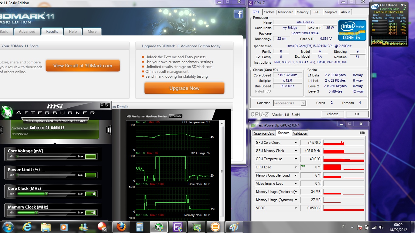 Running the tests with CPU-Z in background, I saw that in fact the processor frequency is kept high under load, but returns immediately to lower levels when the benchmark is finished. I also installed the newer Geforce drivers released today (306.23), but no progress was made. My score keeps around 1500 points on 3DMark11: NVIDIA GeForce GT 640M LE video card benchmark result - Intel Core i5-3210M Processor,Sony Corporation VAIO score: P1553 3DMarks