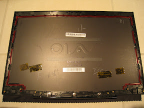 The front portion of the bezel is attached to the original panel with a thin strip of adhesive along the bottom of the screen. Carefully pull the 40-pin connector straight out of the socket and the bezel/LCD unit will be free. Separate the bezel apart from the LCD slowly to release the adhesive. The carbon-fiber back portion of the screen can be removed by unscrewing the six large-headed screws on the hinges. Draw an outline of the metal hinge on the carbon fiber panel with a permanent marker before you remove it from the body. This will remind you where to cut the new lcd panel. The wifi antennas peel-off and the webcam just pulls straight out.