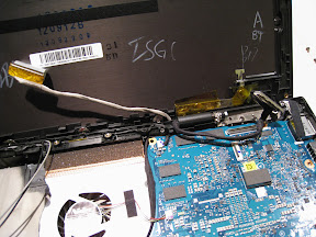 Re-attach the WiFi antennas and webcam and route the cables in their original positions on the back display frame. Here is where it gets tricky because you have to reroute the webcam cable underneath the metal hinge while re-screwing the back frame on. Check and see if there are any other portions of the frame that need to be cut off in order to do this properly. After you have the back frame screwed in, connect the display to the LVDS cable and set it in place within the back frame. The portions of the circuit board you’ve cut out should match the contours of the hinge.