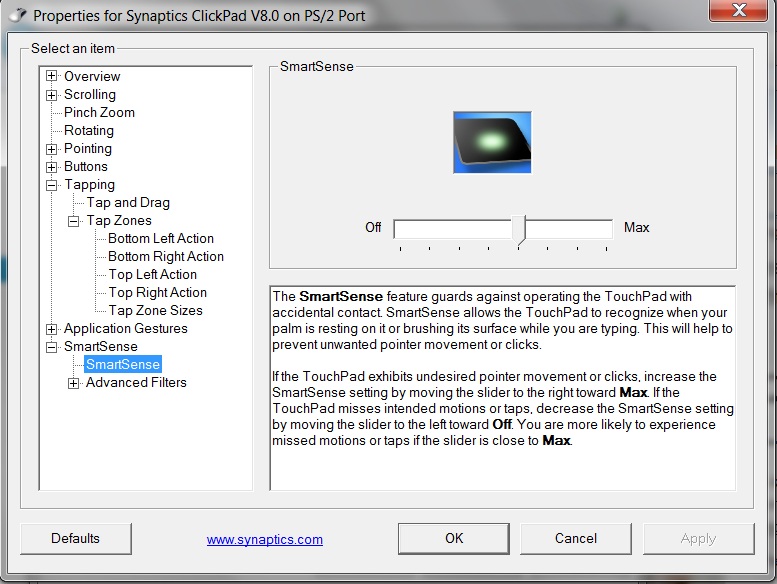 "SmartSense" is an option in the Mouse settings menu. It enables you to increase or decrease the sensitivity of the mouse. Decreasing it reduces the chance that you will accidentally re-position your cursor with accidental swipes. Increasing it should solve the problem of "taps" not registering as clicks. But you can't have both - increase sensitivity for one problem and decrease it for the other. So installing "TouchFreeze" fixes this. TouchFreeze disables the mousepad while you are typing and immediately re-enables it when you stop. Therefore you DONT need to *reduce* your "SmartSense" setting. This program takes care of the accidental swipes and cursor repositioning. Next you can take your "SmartSense" setting and put it to "Max" (or whatever necessary). This will increase your mousepad sensitivity if you are having issues with taps not registering. The combination should both address the oversensitivity swipes and the lack of sensitivity to taps. Don't ask me how the same mousepad can be both oversensitive and not sensitive enough. ...