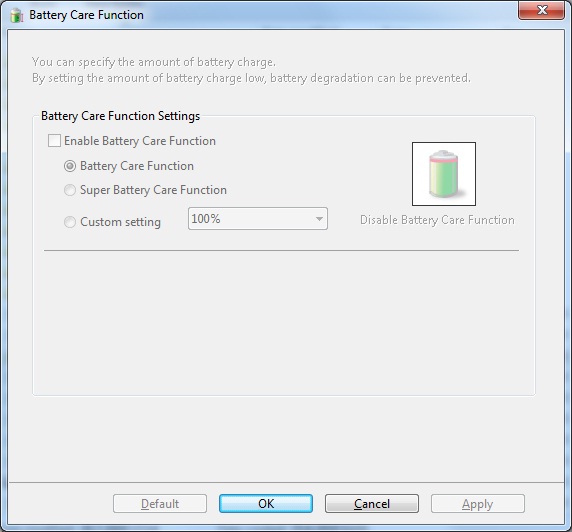 Hello, I once turned this function on in Vista, but now I'm on Windows 7 and my battery can charge only to 80 percent. I want 100 percent, but when I open BatteryCare.exe I cant change anything in that window, everything is disabled. Sony software suck, every single application from Sony