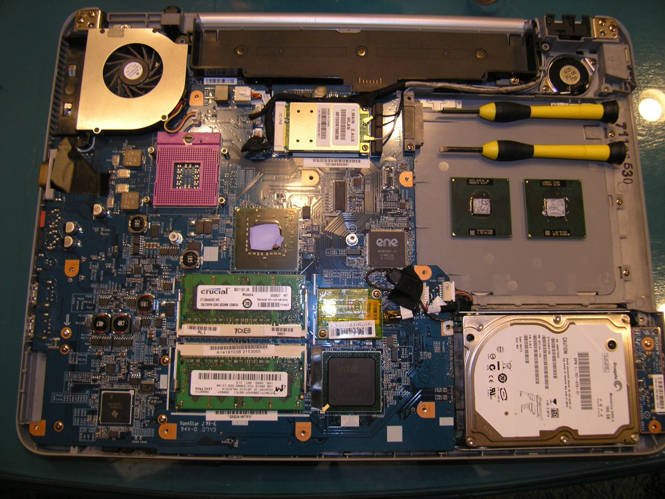 Here are some pictures. The whole process of swapping processors was, as I stated before, really simple. It was just a matter of removing the bottom cover, removing the heat pipe assembly and then just working the socket. Oh, not to forget, polish the CPU tops and reapply some heat sink grease to the T8100.