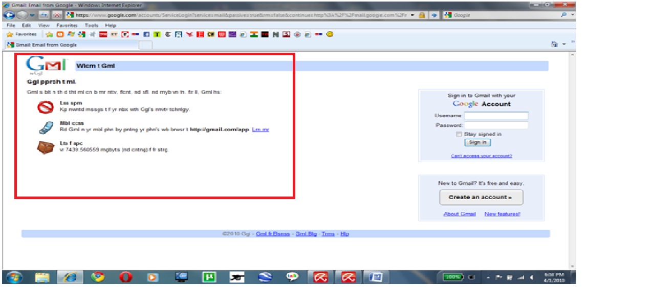 Quick question: Are you folks seeing something very odd about the Gmail login page? All gibberish (or a language) which I do not understand? I have not logged in though. I have tried this using IE8, Opera and Chrome.